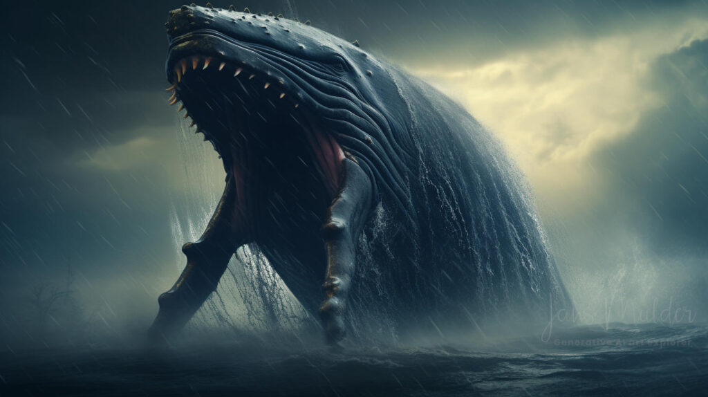 Maar toen, in een surrealistische wending van gebeurtenissen, kwam een enorme walvis uit de diepte tevoorschijn en brak door het water, klaar om Jona op te slokken.