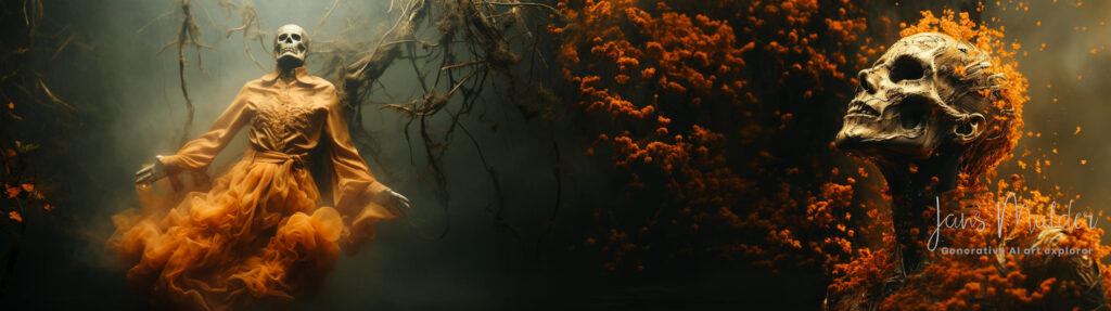 Ik stond op van mijn stoel en de mist trok langzaam weg. Daar doemde een automatische deur op, gehuld in een vage oranje gloed die het zicht belemmerde op wat erachter verborgen lag. Een onweerstaanbare drang om de poort binnen te gaan overspoelde me. Ongecontroleerd sprintte ik naar de deuren en op het moment van aanraking voelde ik een elektrische schok door mijn lichaam schieten, terwijl een verblindend licht me omhulde. En daar was ik, omringd door het geritsel van papier, rinkelende telefoons, fluisterende gesprekken en het ritmische getik van ouderwetse toetsenborden. Ik hoorde een lage, nasale stem: “Welkom in je hiernamaals, JJM25041959.” Ik keek om me heen en zag een kantoor in jaren 50-stijl, met mintgroene muren en pisgele tegelvloeren. Maar er klopte iets niet. Naast me stond een skelet gehuld in een babyblauwe jurk met roze bloemmotieven en een rode pruik. Mijn eigen handen, eens bedekt met vlees en bloed, waren nu slechts gladde witte botten.
