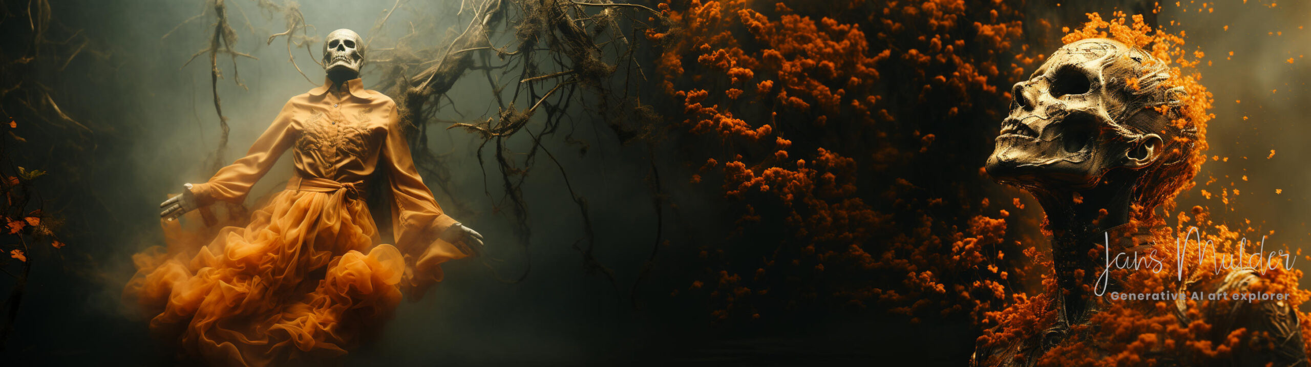 Ik stond op van mijn stoel en de mist trok langzaam weg. Daar doemde een automatische deur op, gehuld in een vage oranje gloed die het zicht belemmerde op wat erachter verborgen lag. Een onweerstaanbare drang om de poort binnen te gaan overspoelde me. Ongecontroleerd sprintte ik naar de deuren en op het moment van aanraking voelde ik een elektrische schok door mijn lichaam schieten, terwijl een verblindend licht me omhulde. En daar was ik, omringd door het geritsel van papier, rinkelende telefoons, fluisterende gesprekken en het ritmische getik van ouderwetse toetsenborden. Ik hoorde een lage, nasale stem: “Welkom in je hiernamaals, JJM25041959.” Ik keek om me heen en zag een kantoor in jaren 50-stijl, met mintgroene muren en pisgele tegelvloeren. Maar er klopte iets niet. Naast me stond een skelet gehuld in een babyblauwe jurk met roze bloemmotieven en een rode pruik. Mijn eigen handen, eens bedekt met vlees en bloed, waren nu slechts gladde witte botten.