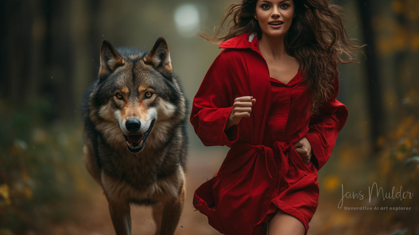 Op een sombere dag, toen de zon zich achter grijze wolken verborg, stuurde moeder Roodkapje naar haar zieke grootmoeder met een mand vol lekkernijen. Maar het bos had honger en rook de geur van haar avontuurlijke ziel. Roodkapje, argeloos als ze was, zwierf af van het pad. Plotseling dook er een merkwaardig wezen op – de Boze Wolf met glinsterende ogen en een grijnzende snuit.