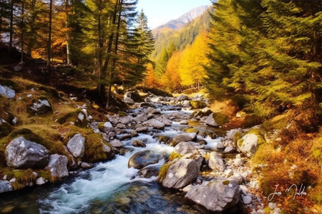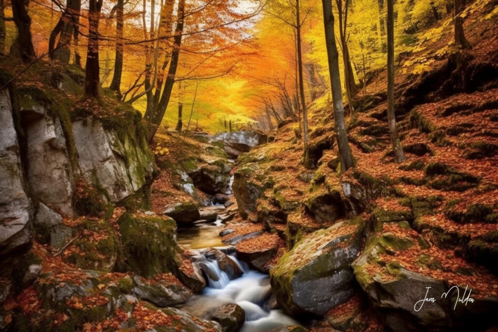 De schoonheid van de herfst is overal; verborgen open plekken met stroken zonlicht die door het bladerdak piepen, met sneeuw bedekte bergen die opdoemen aan de horizon boven me, en de voorzichtig borrelende beek die langs mijn voeten verder naar beneden, naar de vallei stroomt.