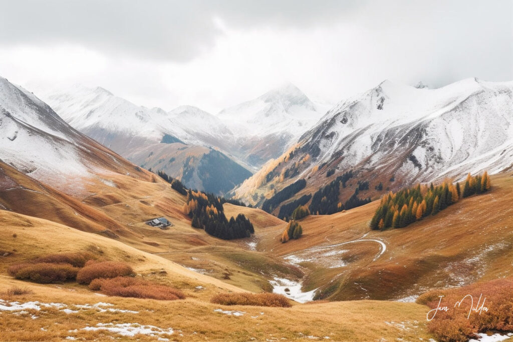 Terwijl ik mijn voetreis haastig vervolg, kom ik eindelijk bij het kleine meer dat omringd is door de hoge bergtoppen. Het contrast tussen de blauwe schakeringen van de lucht en het donkergroene water van het meertje is opmerkelijk. Het is alsof een magische kracht het land in zijn greep heeft. De zon begint nu echt onder te gaan en de weerspiegeling van de oranje en rode tinten dansen over het meer. Ik voel een koude rilling in de lucht terwijl ik rondkijk en de toppen van de Alpen rondom me zie bedekt met een deken van sneeuw. De sneeuw lijkt te glinsteren in het afnemende licht van de zon en ik voel de warmte ervan afstralen. Ik sta hier, betoverd door de schoonheid van dit alles en ik wist dat de herfst echt een van de mooiste seizoenen in de Alpen is.