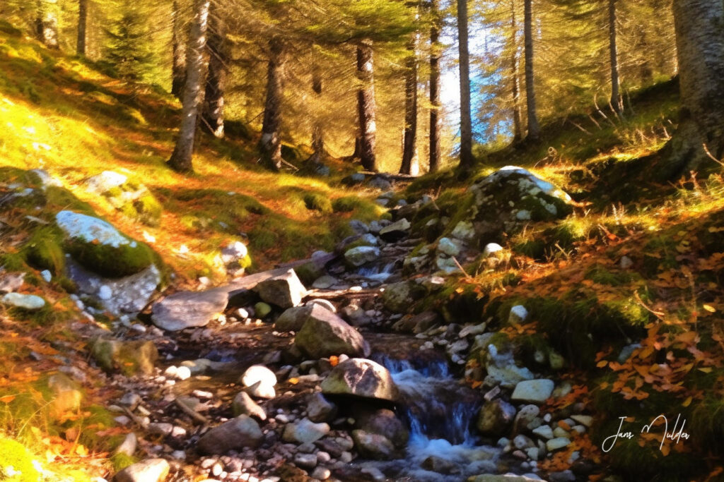Terwijl ik blijf rondkijken, merk ik de beek met de naam “La Combe de Bal” weer op. Het water is kristalhelder en het geluid door dat het over de rotsen stroomt is zo rustgevend. Ik voel de warmte van de laatste zonnestralen op mijn huid, maar de kilte in de lucht blijft verfrissend. Ik haal diep adem en de geur van het bos brengt me weer terug naar het huidige moment.