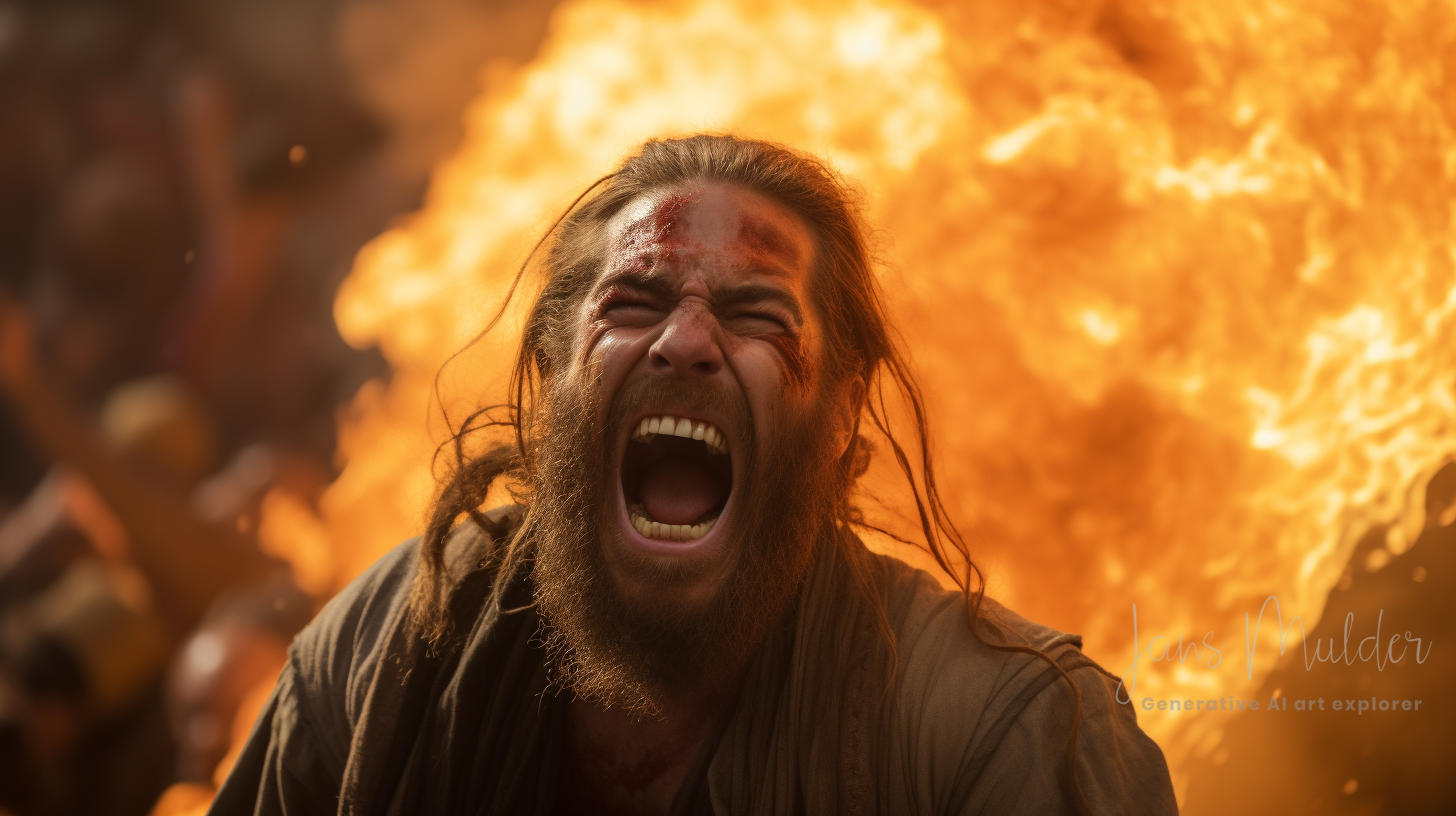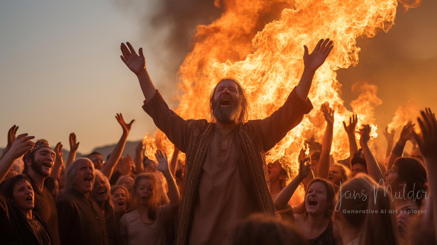 Elia stapt naar voren, zijn gezicht woest en vastberaden, en roept de naam van de God van Israël aan.