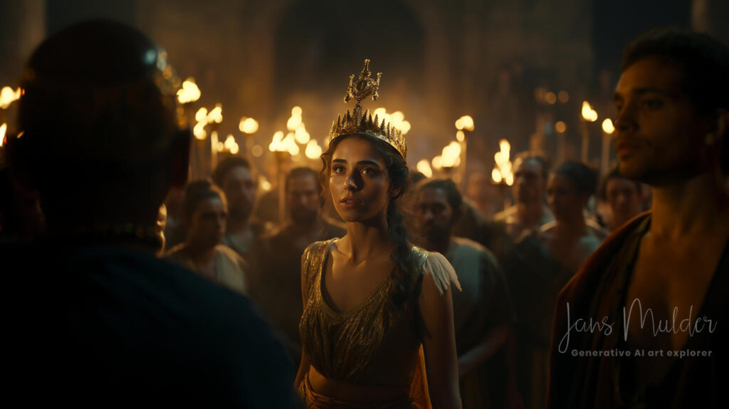De eens zo trotse en zelfverzekerde Jezebel staat voor de menigte, haar koninklijke gelaat verbrijzeld. Haar ogen branden van schaamte en woede, haar gezicht is rood gekleurd.